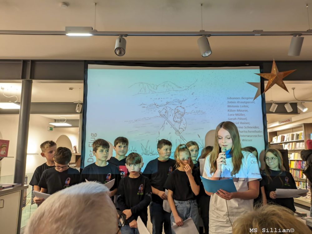 Die 1m Klasse mit Kollegin Schneider Karin war für den musikalischen Teil der Veranstaltung verantwortlich. Es wurden 3 bekannte Lieder mit umgedichteten Texten, passend zur Reise des blauen Blattes, und 3 wunderschöne Weihnachtslieder präsentiert. SchülerInnen aus der 3m und 3b lasen Teile aus den verschiedensten Geschichten aus dem Buch vor.