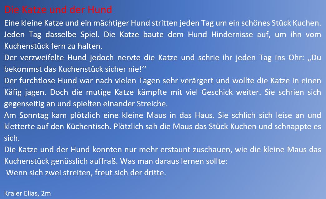 In einem weiteren Schritt haben wir die Zeit des Lockdowns dazu genützt, uns beim Schreiben von eigenen Fabeln auszuprobieren oder Fabeln umzuschreiben. Einige Ergebnisse könnt ihr hier lesen. Viel Spaß dabei wünschen euch die 2m-Klasse!