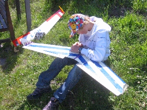 Neben den Feinarbeiten an den Ruderklappen und Kohlefaserstäbchen werden die Flieger mit Farbbändern verschönert.