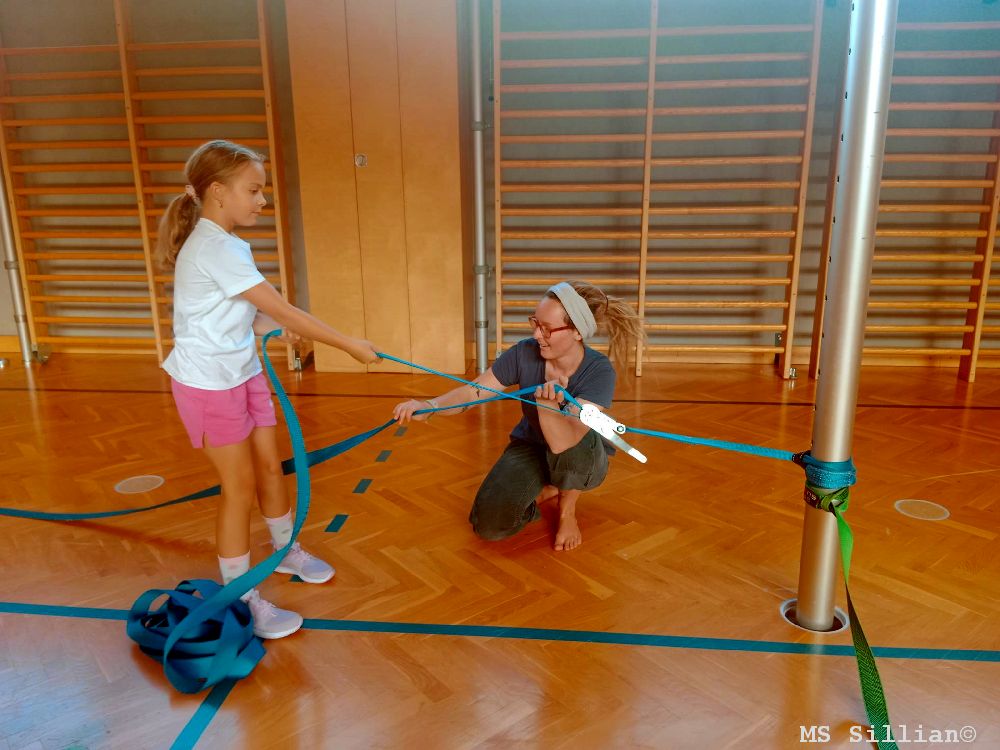 Unter der Anleitung von Profi-Slacklinerin Katharina Ortner aus Sillian konnten die SchülerInnen erste Erfahrungen in dieser Sportart erleben. Beim Slacklinen balanciert man auf einem Band, das zwischen zwei Fixpunkten (meistens Bäume) gespannt ist.