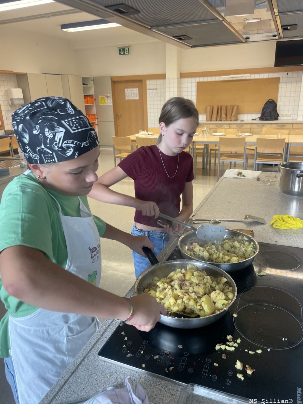 Natürlich wollten wir die Kartoffeln nicht nur anschauen, sondern auch probieren. In der Schulküche haben wir daraus eine leckere Kartoffelsuppe und ein herzhaftes Geröstl gekocht. Außerdem haben wir aus unseren violetten Kartoffeln im Airfryer knusprige Chips gemacht – die sahen nicht nur cool aus, sondern schmeckten auch richtig gut!