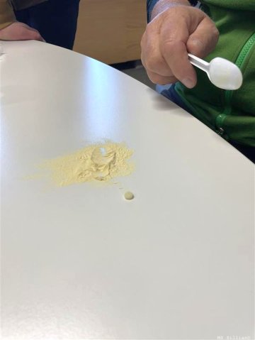 - In einem weiteren Versuch wurde gezeigt, wie sich Wassertropfen im Pulver einhüllen und zu kleinen Kugeln rollen lassen.