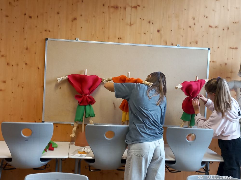 Im heurigen Schuljahr hat sich die 4m-Klasse mit vollem Eifer auf den kreativen Weg gemacht, aus Holzstöcken und verschiedensten Materialien kunstwerkhafte Vogelscheuchen zu kreieren. Eine gute Portion Geschicklichkeit, die diese Arbeit erfordert, und der richtige Umgang mit diesen Werkstoffen lassen nun die Vogelscheuchen in leuchtenden Farben erstrahlen.