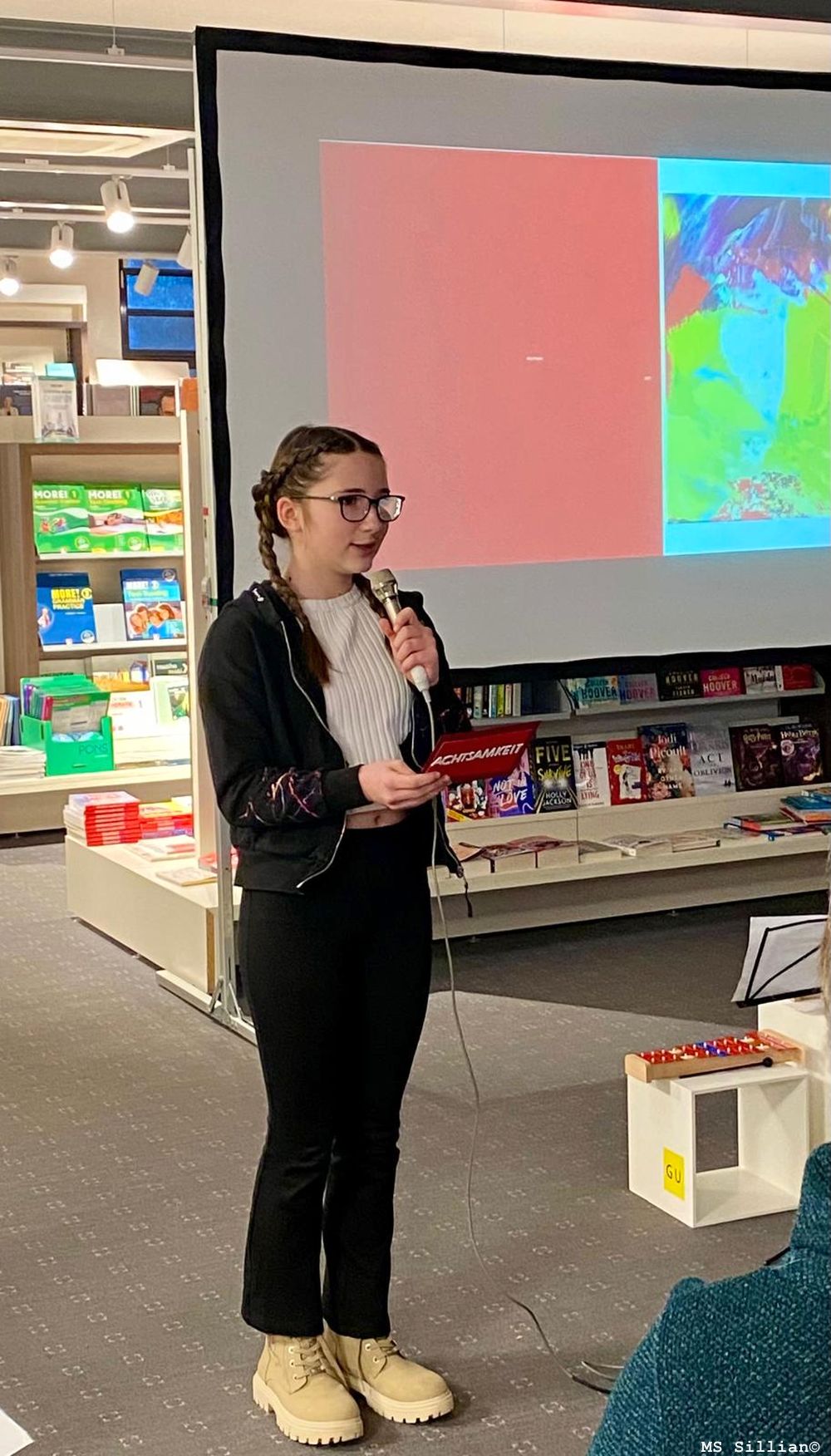 In der Tyrolia in Lienz lasen 6 Schüler/-innen ihre Texte und die von Kollegen/-innen vor. Die 2m mit ihrer Lehrerin Karin Schneider interpretierte sehr gekonnt 3 Lieder von Max Raabe und für die Kulinarik sorgte die 3m mit ihrer Lehrerin Sabrina Fuchs mit feinen Sternenbrötchen.