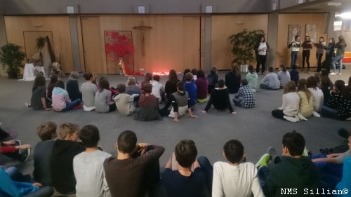 Gemeinsam feiern wir in der Aula, mit Lichtern, Texten und Musik, die unser Herz öffnen und uns auf das bevorstehende Weihnachtsfest einstimmen sollen.