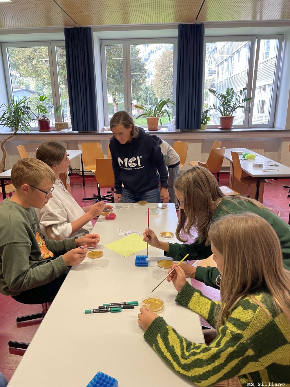 Außerdem führten die Schüler*innen ein biologisches Experiment durch: Sie mischten Hefe mit Nährmedium, verteilten es auf Nährböden und beobachteten, wie sich Bakterien und Pilze auf den Oberflächen ansiedelten.