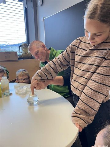 Im Anschluss wurde der Bärlapp genauer untersucht. In der Klasse führten die Kinder spannende Experimente mit Bärlappsporenpulver durch: