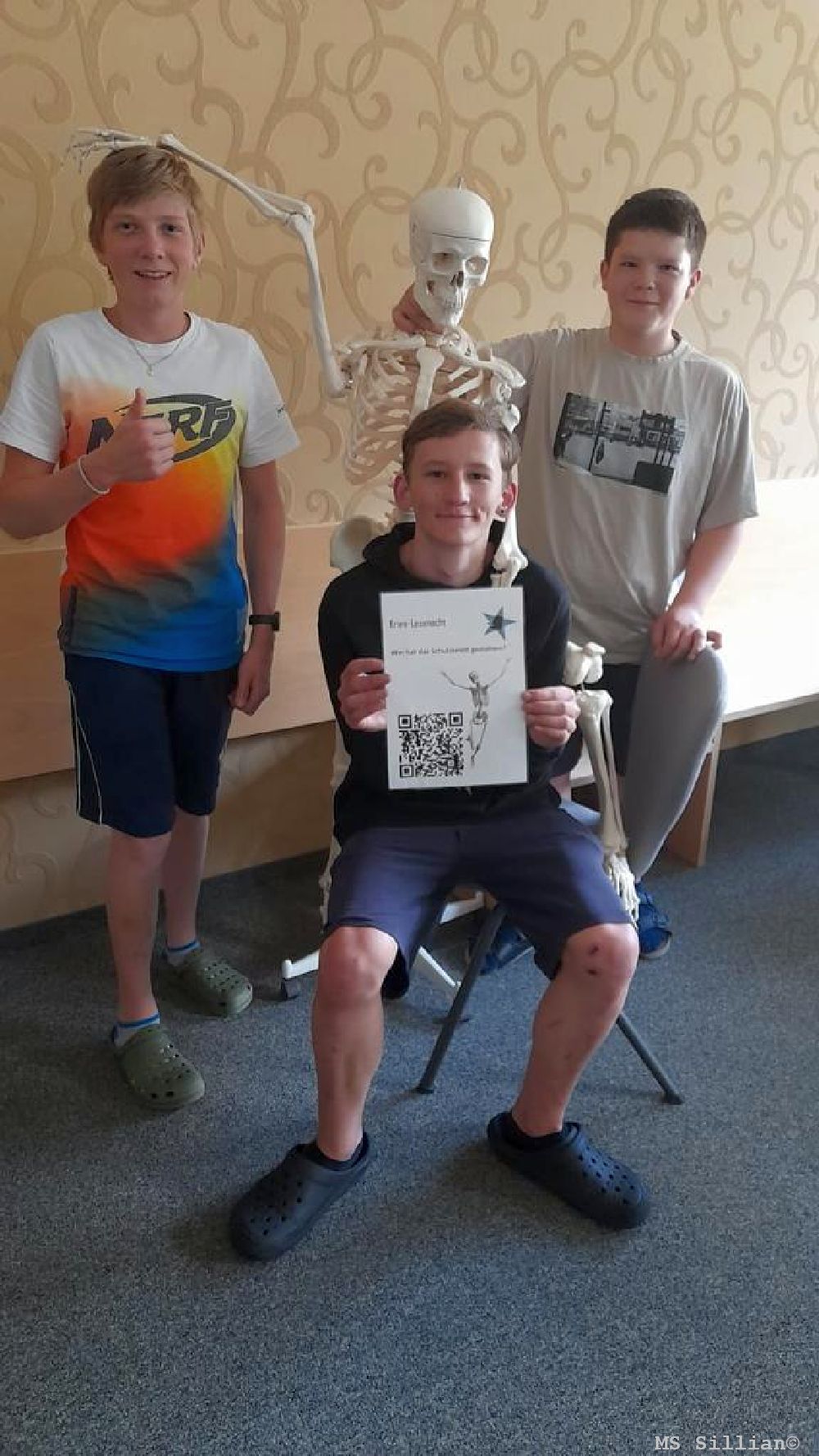 Die Hobbydetektive mussten jeden Winkel des Schulhauses erkunden, um möglichst viele Punkte bei den insgesamt 10 Stationen zu sammeln. Dabei wurden ihre logische Denkfähigkeit und Kombinationsgabe auf die Probe gestellt. Die Kinder waren voller Eifer bei der Sache und motiviert, die Rätsel zu lösen. Sie scannten QR-Codes, um den Dieb des Schulskeletts Maximilien entlarven zu können, ordneten Fachausdrücke der Polizeisprache ihren Bedeutungen richtig zu, fanden und fotografierten eine bestimmte Seite eines bestimmten Krimi-Buches in der Bücherei, lösten Sudoku-Rätsel, spielten und filmten einen Sketch und vieles mehr.